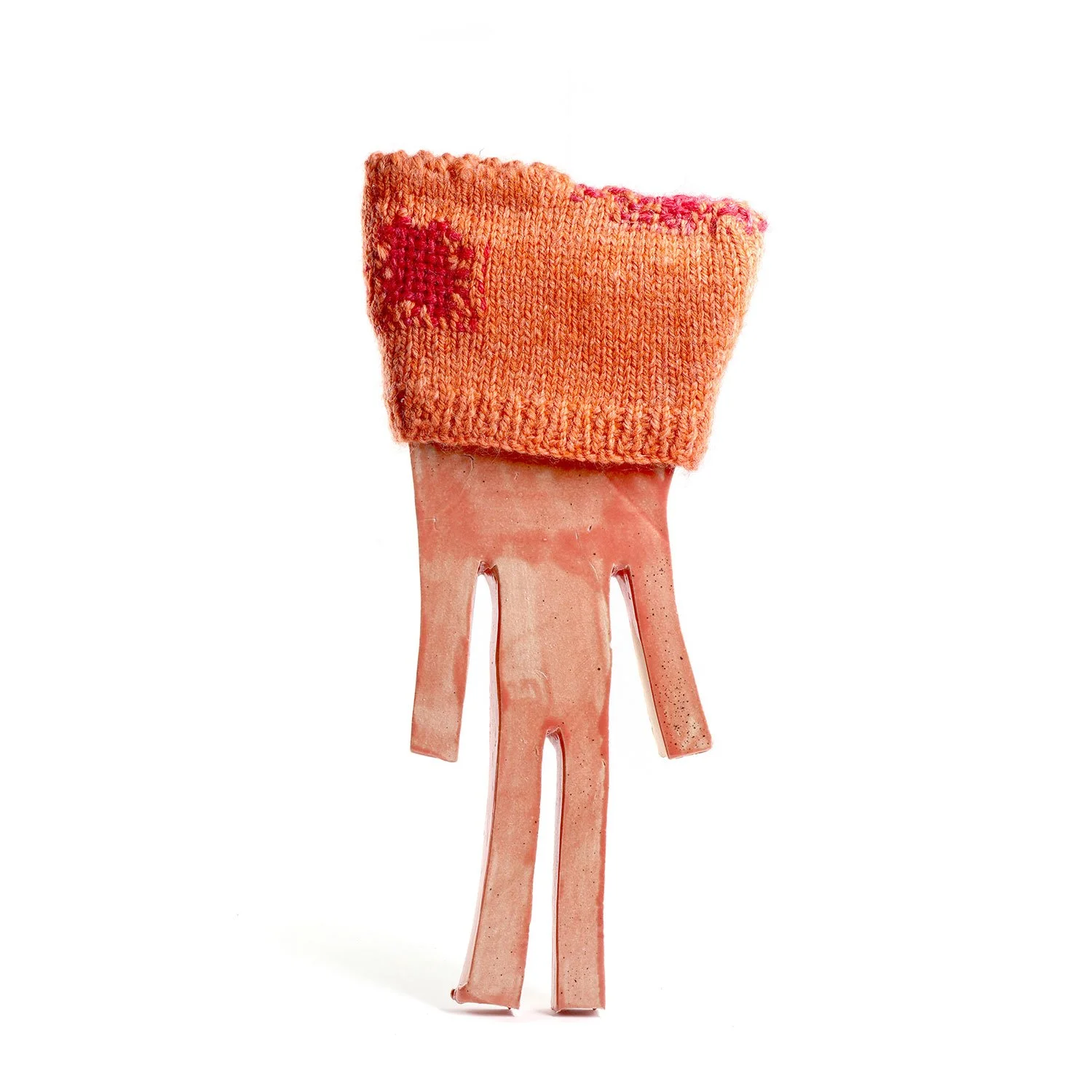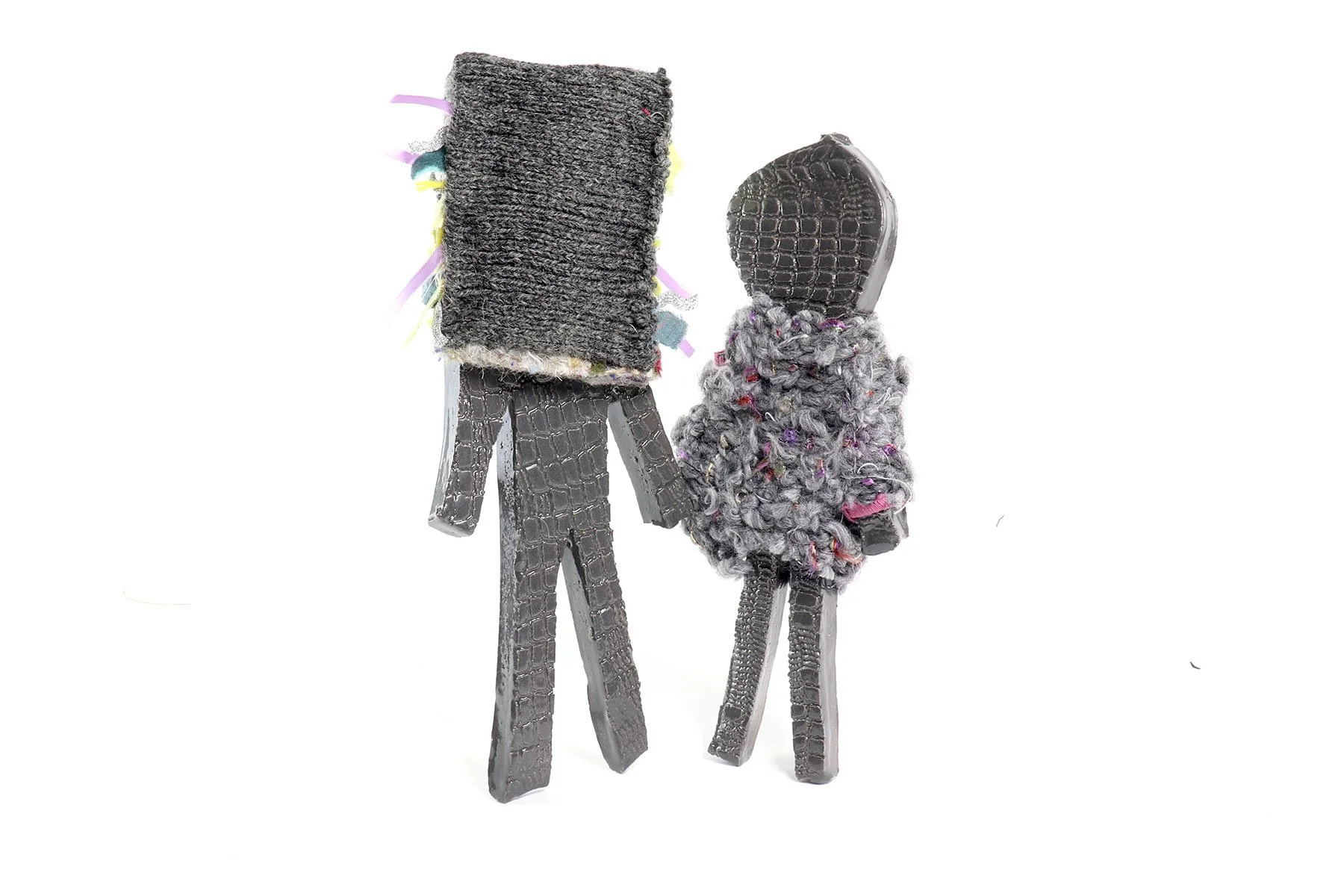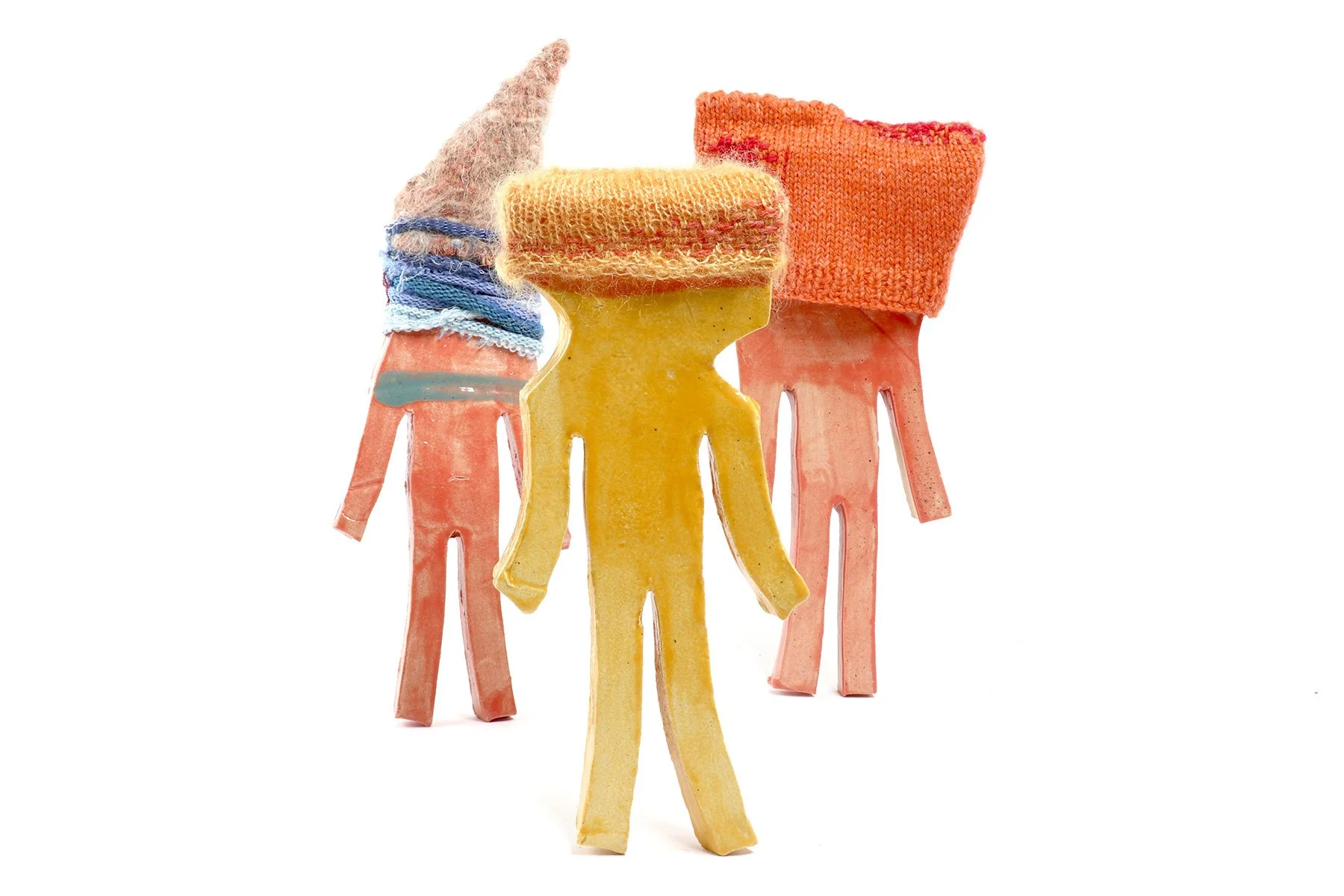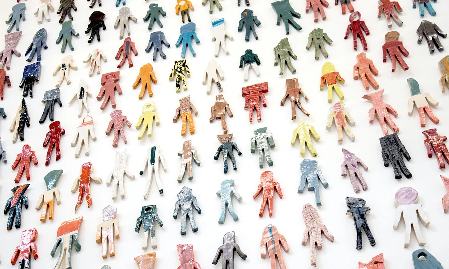 series of ceramic wall hangings by Franko B with individually hand-made clothes by Rachael Matthews