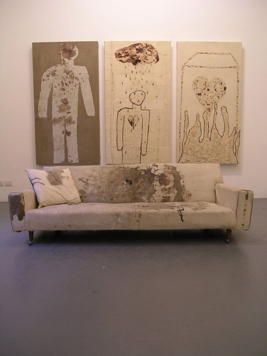 His three-dimensional work was also based on similar premises. The streets of London’s East End don’t have the elegance and grandness of their Western counterpart; their richness is the vast multiethnic heritage, the social diversity and the irregular, often incomplete architecture. Modern buildings alternate with others that have not yet been properly rebuilt after the Second World War. It’s in this colourful setting that Franko B started working with sculpture alongside his photographic work. Objects of different provenience and meaning were collected by the artist during the day and night and then brought to his studio where they waited to find a place in his artistic world. A first step in this direction was the creation of ‘environments’, as the one shown at the Home Gallery in London in 2001. The transition from performances to sculpture was crucial. The actions of Franko B were in fact mainly focused on the artist himself, with the body playing a leading role. At the moment of translating this philosophy into a two or three-dimensional form, the presence of their creator became more subtle. His early paintings were mostly red and white – the trademark colours of his performances; alternatively there were self portraits and portraits of people close to the artist. In his sculptures, apart from some exceptions like the self portrait created for his one man show at Galleria Pack in 2004, Franko B’s figure was a discreet presence, which highlights yet again how a limit can be turned into an advantage.