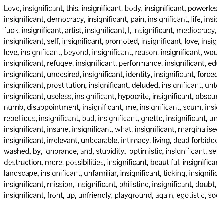 Love, videos, exposure, insignificant, powerless, soul, never, Guilliermo, bears, pain, life, refugees, tattoo, shit, fuck, Kira, Lois, I, Kamal, Hepatitis, village, self, promoted, Tim, love, more, love, dinner, Adrian, wounds, sound, refuge, performance, Manuel, falling, Hugo, forced, sucked, flu, unforced, prostitute, deluded, untouchable, uncool, life, useless, hypocrite, obscure, live, Daniel, poison, fear, numbers, transport, vaginal, disappointment, insignificant, me, fearless, scum, anal, rebellious, bad, ghetto, untidy, secure, object, mass, insane, Marcia , Marissa, Amelia, unbearable, intimacy, living, boxes, forbidden, dying, Marina, optimistic, loud, self, opportunistic, isolated, destruction, more, possibilities, beautiful, corrupted, landscape, unfamiliar, ticking, time, Cai, mission, philistine, hiring, front, up, unfriendly, playground, Ill, untouchable, again, egotistic, dying, entertainment , chaos, diseases, firing, elemental, terror, opportunistic, fragment, power, certain, Dominic, land, moral, Manick, home, Jennifer, abandoned, mental, visiting, Tom, war, artist, London, pain, Birmigham, Susie, never, fired, Bristol, Katherine, Donna, unknown, unhealthy, Sheffield, marriage, anarchic, dishonest, for, ever, overwhelming, irrelevance, mother, low, revolutionary, ours, warmth, insecure, birth, maniac, discontinued, taboos, ghettos, living, transmission, bastard, Francesca, believe, over, you, son, free, dirty, insecure, dislocated, heroin, Maria, untouchable, missing, sleazy, lost, radio, cowards, time, less, obsolete, love, Iraq, Seth, swimming, removed, site, mean, Newcastle, insincere, naked, spoiled, drinking, untouchable, meaningful, tired, questioning, freak, mentoring, powerful, liar, everything, Lucille, civilisation, hunted, Bobby, untouchable, let , down, boys, virus, Brick Lane, pricks, lonely, dogs, hurting, yet, cats, speed, saunas, girls, healthy, delinquent, Tehching, respected, dreamers, useful, hurt, inspiring, love, untouchable, students, Rachel, shameless, local, unprofessional, lust, naïve, pain, neon, tea, Ernst, stoned, supportive, untouchable, ghetto, platform, meeting, fitting, electricity, encounters, cold, inside, hot, inside, fear, outside, you, unloved, unsupported, water, deported, marked, luck, immoral, Ron, love, wet , Gill, Soho, journey, bureaucrats, desire, outsider, audience, lights, insider, bad, theatre, unfair, trust, horse, Gina, techno, bread, help, nights, Julie, days, streets, asking, renting, air, crying, years, abused, dreamer, library, wanker, spanked, glory, over, returning, maybe, emotional, home, also, policing, selling, hole, children’s, fascist, speaking, whole, basking, sisters, hate, betting, Michael, running, punk, trannies, ketamine, stupid, luck, abusing, plastic, making, cash, fagot, homeless, untouchable, networking, machine, Helena, salt, victim, blinded, mafia, bleeding, friends, vomiting, sleep, cement, Bob, Guy, Steve, more, discouraged, love, autocracy, and, time, Linda, dead, breeding, love, help, hard, in, replaceable, lovers, promoting, untouchable, station, safe, landscapes, replaced, Annie, Patty, performance, bitterness, live, big, dick, pain, dignified, burden, traffic, x , rated, bruised, tyrant, Colchester, tolerance, pain, food, arts, untouchable, undesired, impossible, flesh, sick, house, opera, irrelevant, bodies, language, dirty, Antony, baby, bubbly, experimental, with, support, Zhang, alone, psychopath, class, out, Liverpool, clear, mothers, desire, birds, angel, more, less, time, reflection, ecstasy, less, fear, JJ, infections, consumed, sounds, fathers, selfish, rated, slowly, more, waste, corrupt, soul, politics, irreplaceable, archive, Glasgow, museums, blood, clubs, self, angst, pimp, pleasing, stupid, attention, same, lover, for, ever, immigrant, rated, curators, individuality, arrogant, seeker, bourgeois, petty, brother, fierce, untouchable, for, ever, to, ignorant, sharks, love, awake, uncompromised, love, again, ready, dance, history, running, expensive, unfriendly, under, right, wing, centre, more, pain, censorship, Lee, mess, less, me, art, selfish, wrong, platform, architecture, stories, fierce, less, sweet, public, stupidity, study, labour, selfless, inspiring, genius, more, us, driven, attention, promise, illegal, sick, liquid, school, security, losers, never, significant, contrived, untouchable, dreams, for, dreamers, importance, untouchable,